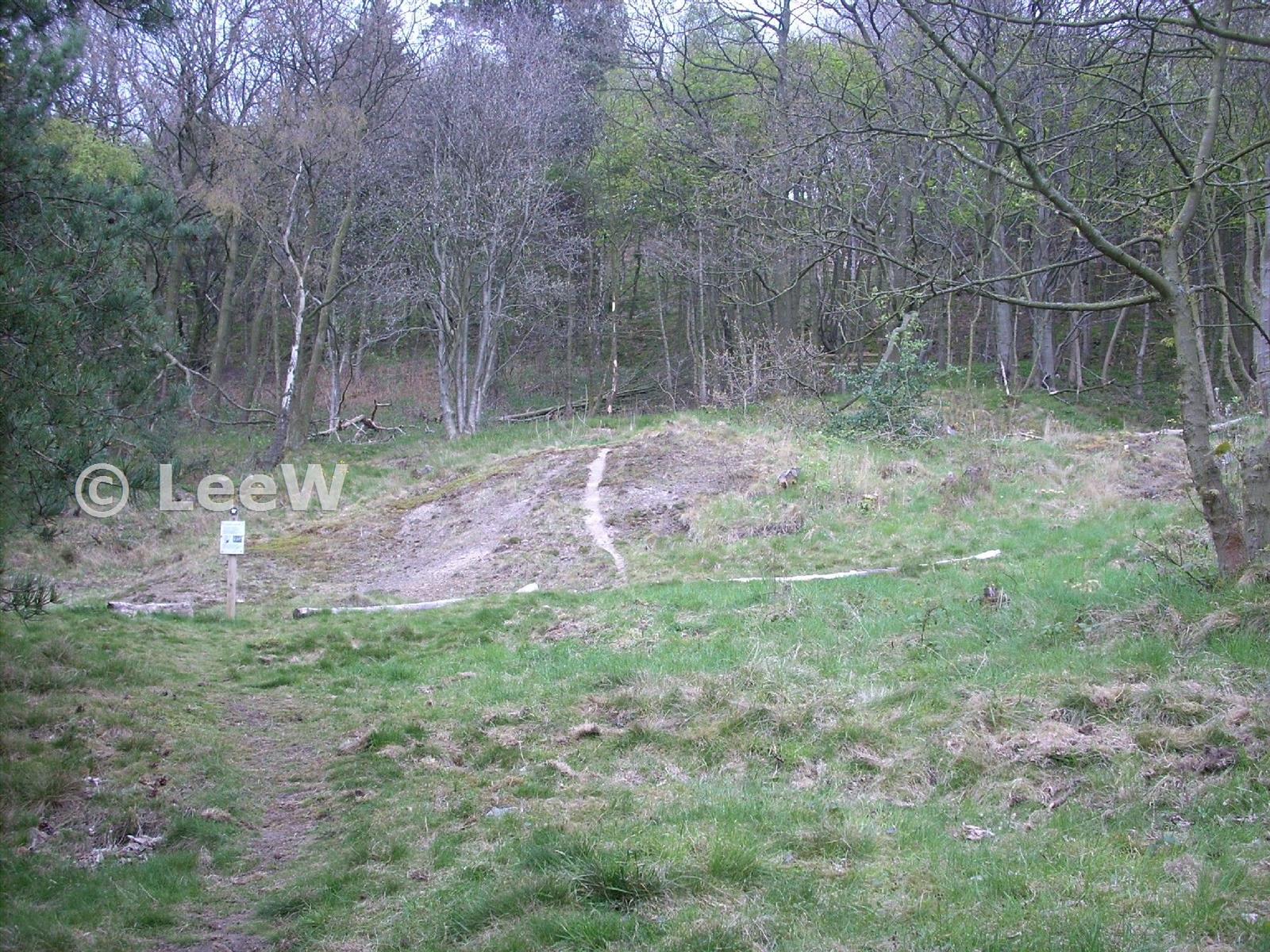 View looking up the site showing waste heap the shaft site/retaining wall are to the right of the photo. The sunken rectangular feature is in hollow (back left) (24 April 2009)