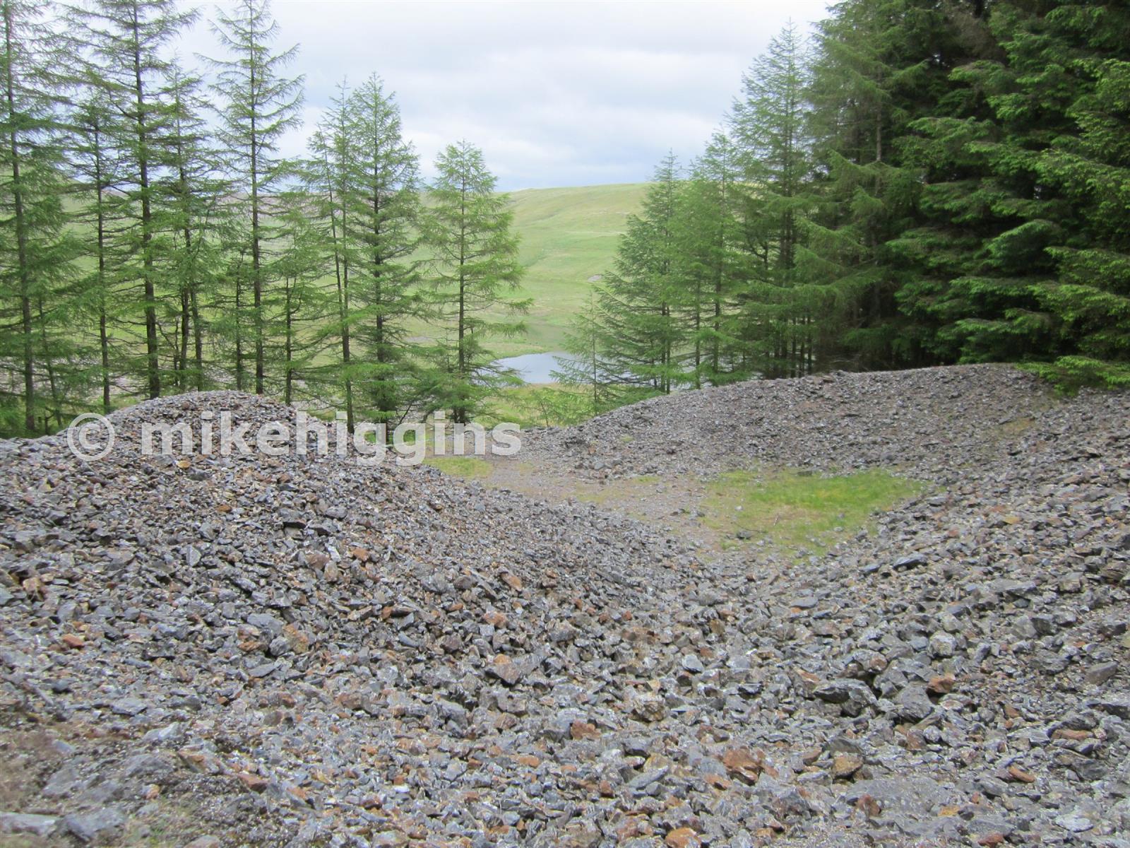 View down the waste heaps towards the NW arm of Nant y Moch reservoir