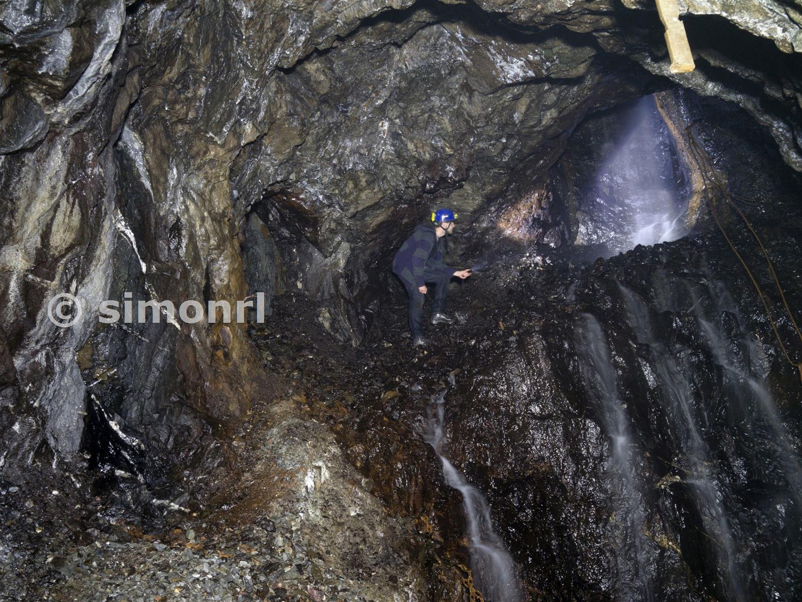 Waterfall - two ladders up from deep adit level Benallt Copper Mine July 2014