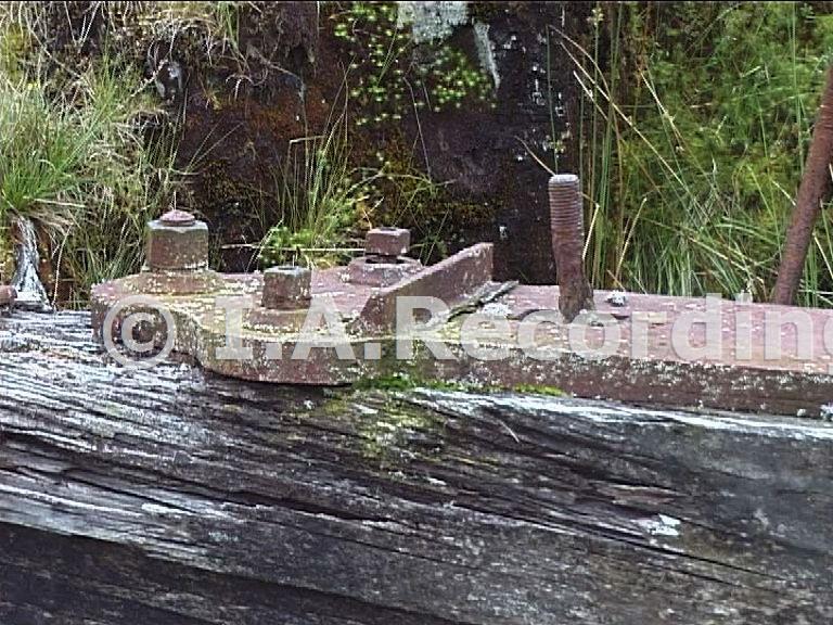Detail of the waterwheel bearing plate - probably dates from c1900 when the 60ft. waterwheel was replaced by a 56ft wheel by John Mills & Co., Llanidloes. [Grab from 12th July 2002 video]