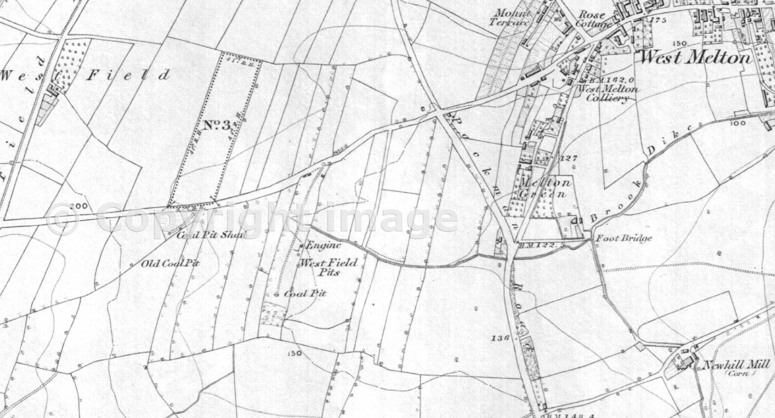The map shows West Field Pits with engine marked. West Melton Colliery is also shown in the top right hand corner.