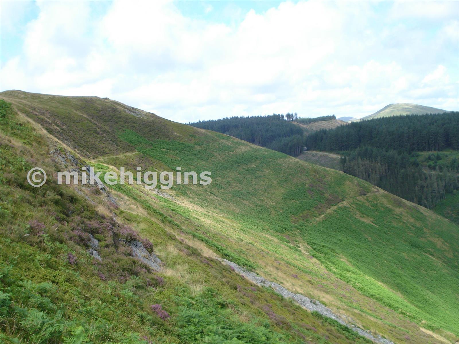 Taken from the same spot as the previous photo and showing the two leats constructed in the 19th Century to supply the water wheels at the Bwlch, Brynpica and Goginan mines.
