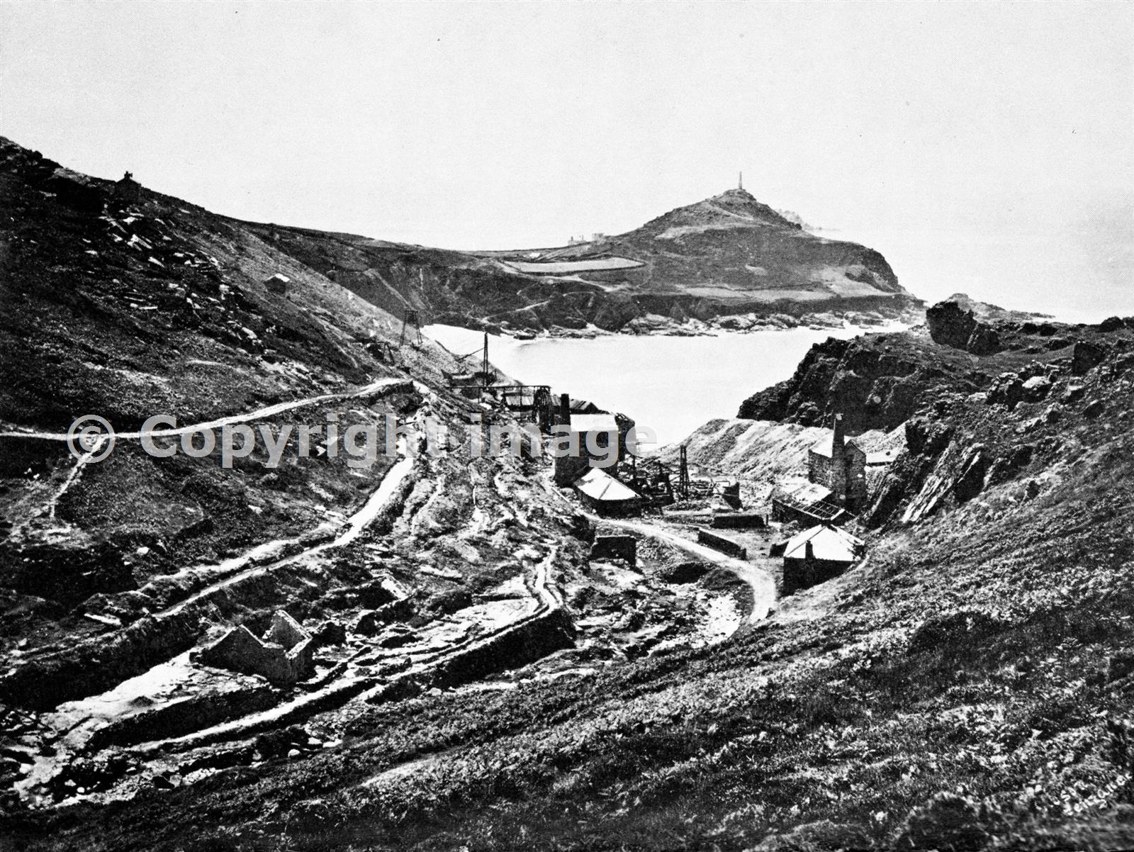 Mine buildings in state of decay. A few years after this was taken a major flood washed away many workings. The main Engine house is in the centre of the picture and behind it can be seen the massive water wheel. The impressive housing still stands