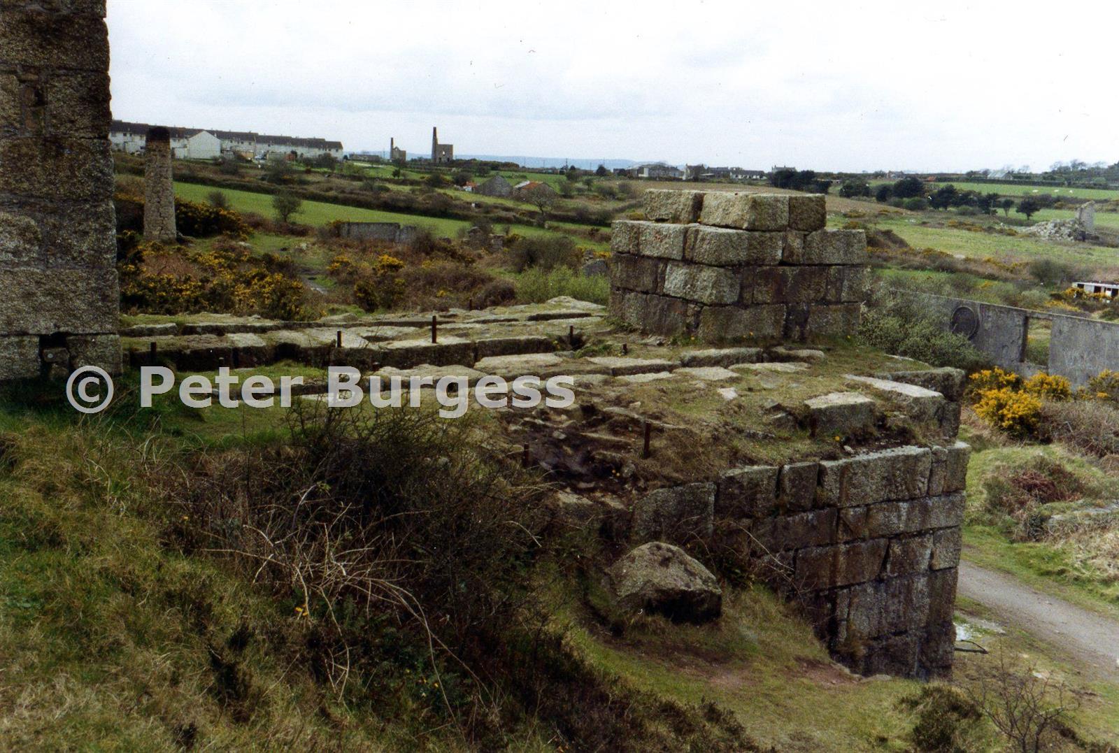 New Stamps at Wheal Grenville, erected ca. 1890. The granite plinth on the edge of the platform supported an auxiliary beam operated by the flywheels, which powered a short lift of pumps to raise water for use in the stamps.