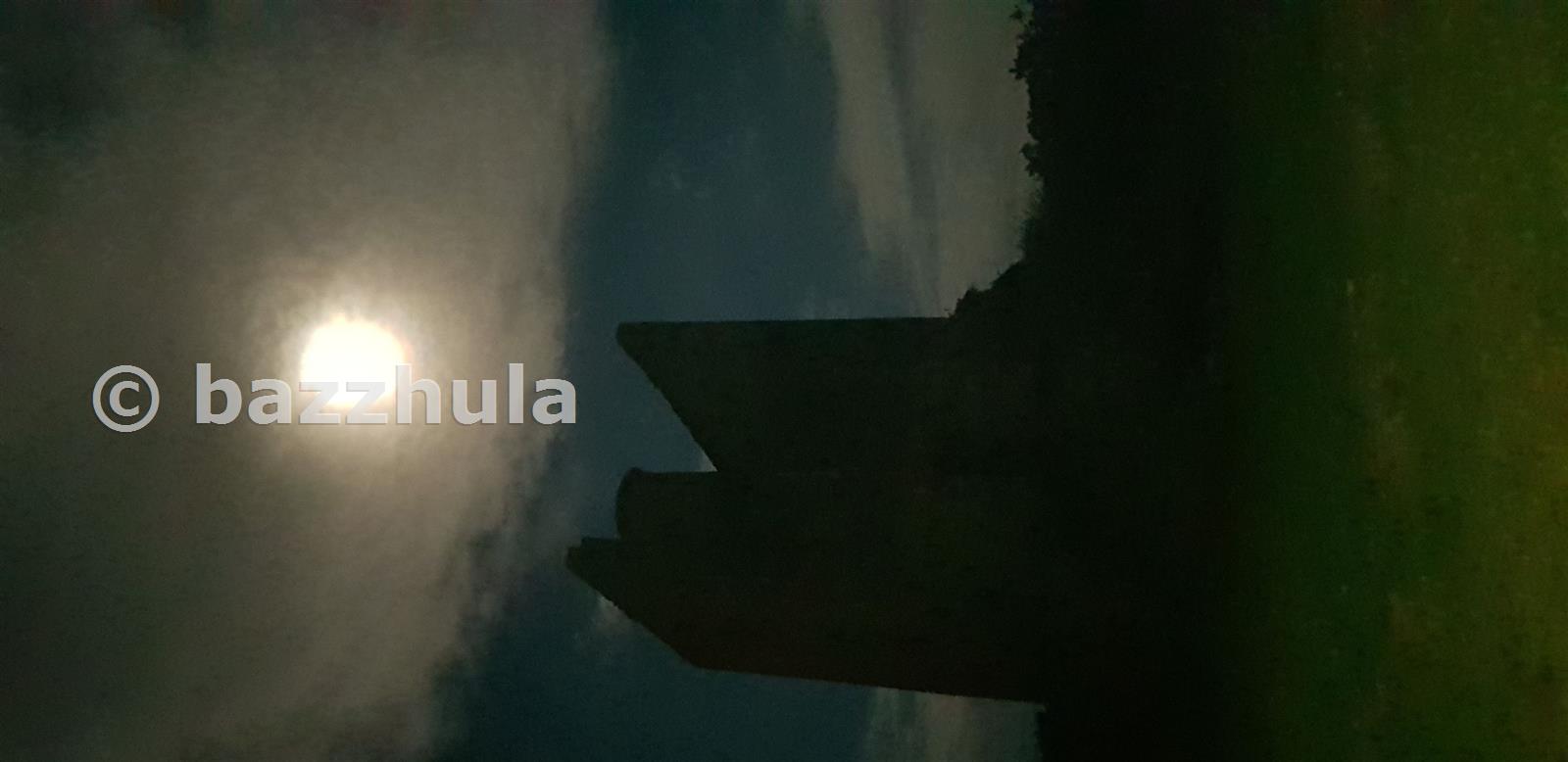 the 2020 supermoon glowing through the clouds appearing close to the stack of a stack associated with wheal harriet Pengegon Camborne Cornwall