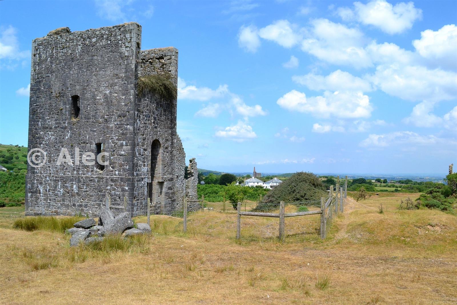 Bellingham''s Shaft Engine House, built 1886, with the shaft itself fenced round post-surface collapse. In the distance (C) Prince of Wales Shaft Engine House of 1907 and (R) Wheal Jenkin Stamps Engine House. Photo taken Friday 13 July 2018.
