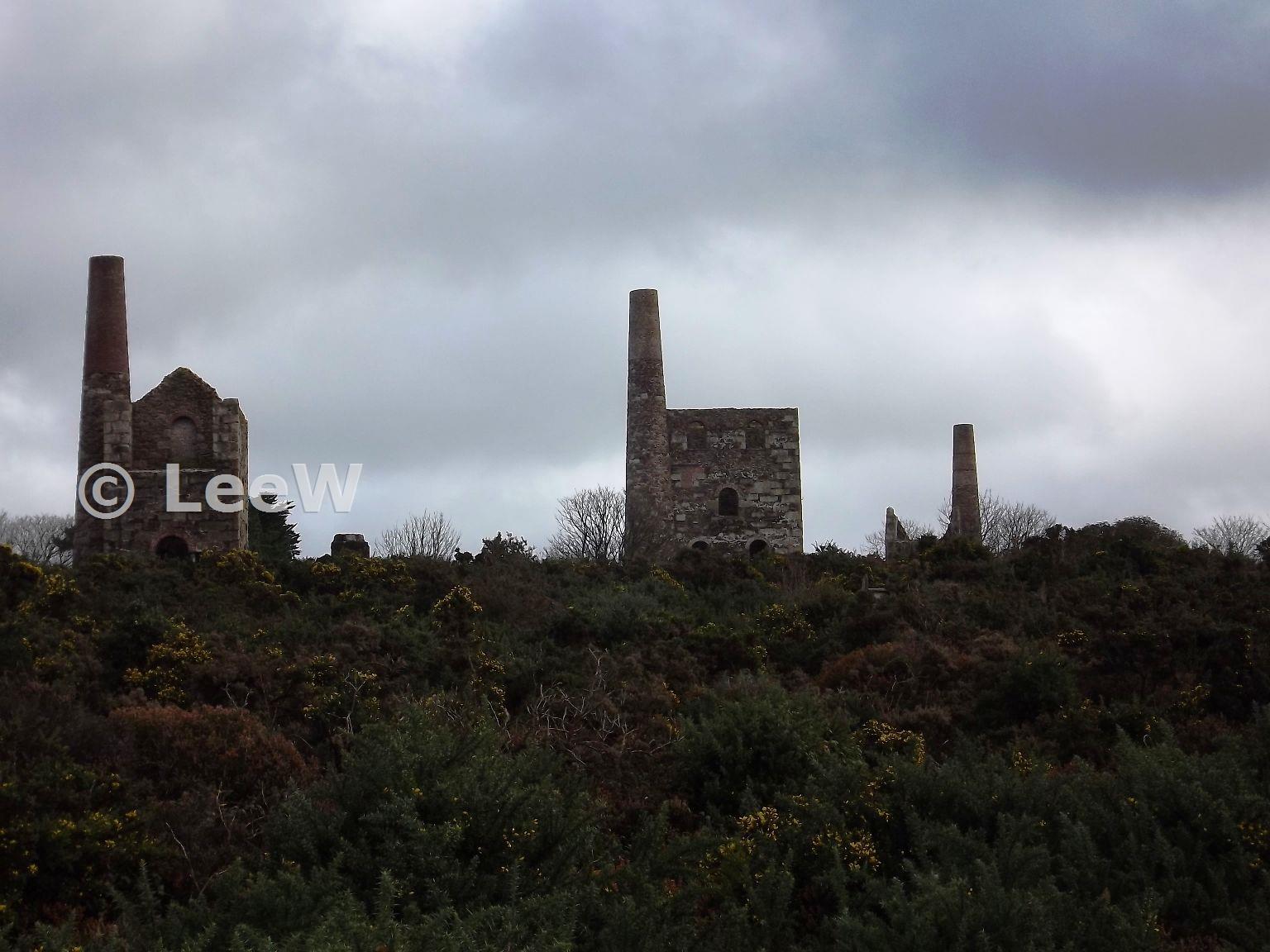 Three engine house of Wheal Peevor. The stamps engine house to the left, the pumping engine house centre and the winding engine house to the right. Nov 2011