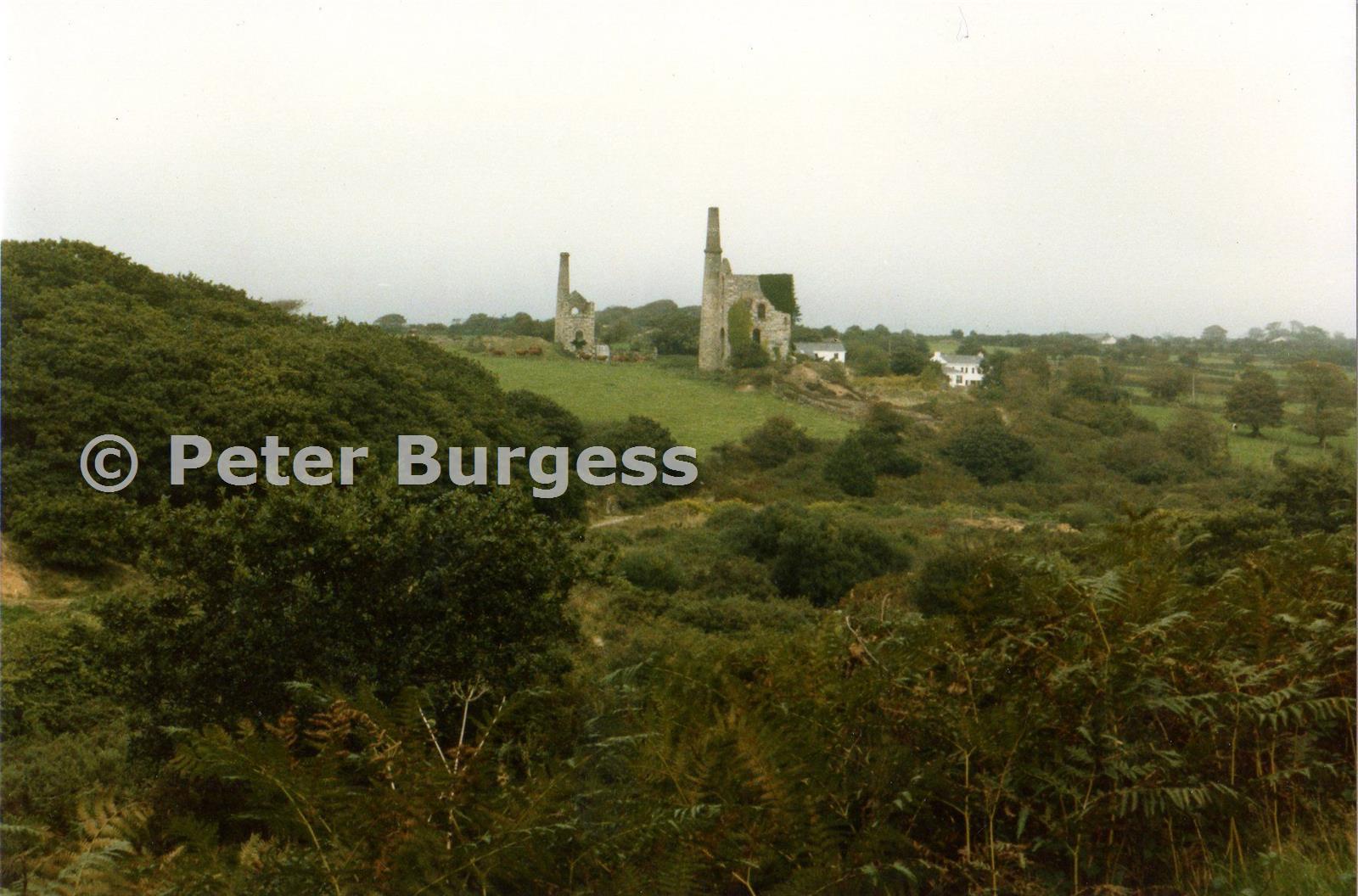 The Unity Wood engine houses viewed from the course of the Poldice Tramroad. 1985.