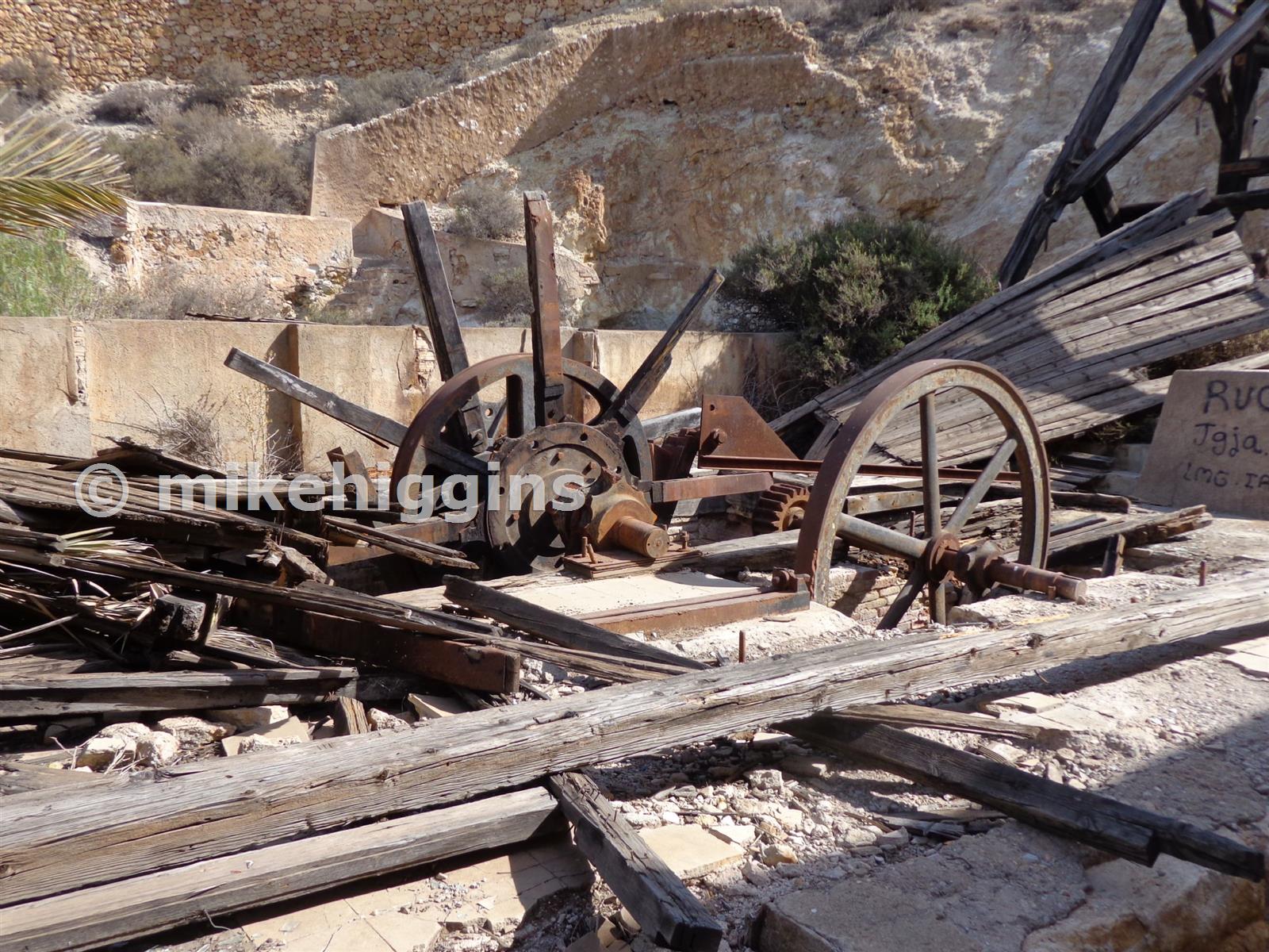 Side view of the remains of the winding machinery (reputed to have been a flat rope winder). The wood lying around is the remains of the wooden building housing the machinery.