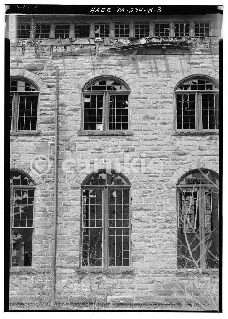 . DETAIL VIEW OF WINDOW ON SOUTH FACADE OF POWERHOUSE. Courtesy Library of Congress, Prints & Photographs Division, HAER, Reproduction number HAER PA,65-YUKO, 1B-3