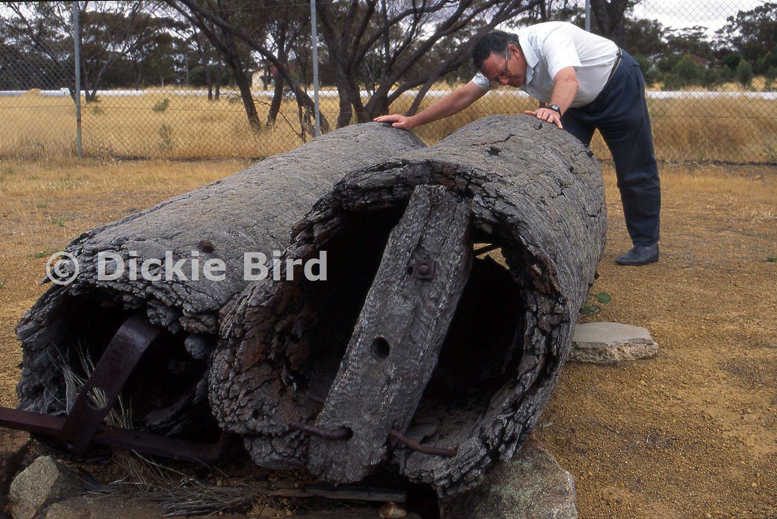 On show at Cunderin are some of the original wooden pipes which were tried out . They proved quite useless, with leaks, rot and the difficulty of joining the sections.