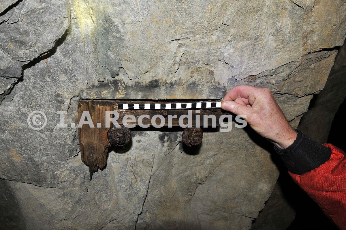 Wooden bracket at the ''Y'' junction of the entrance adit with Stewart''s stope. [b/w scale stick: 1cm squares] [Picture: October 2012]