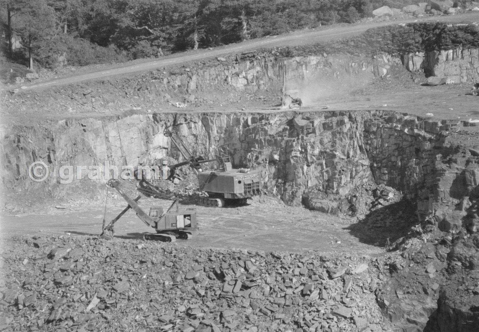 Viewed from Red Lion floor, you can see the drilling machine for the vertical shot holes above the face hard at work, with the excavators ready to handle the rock.