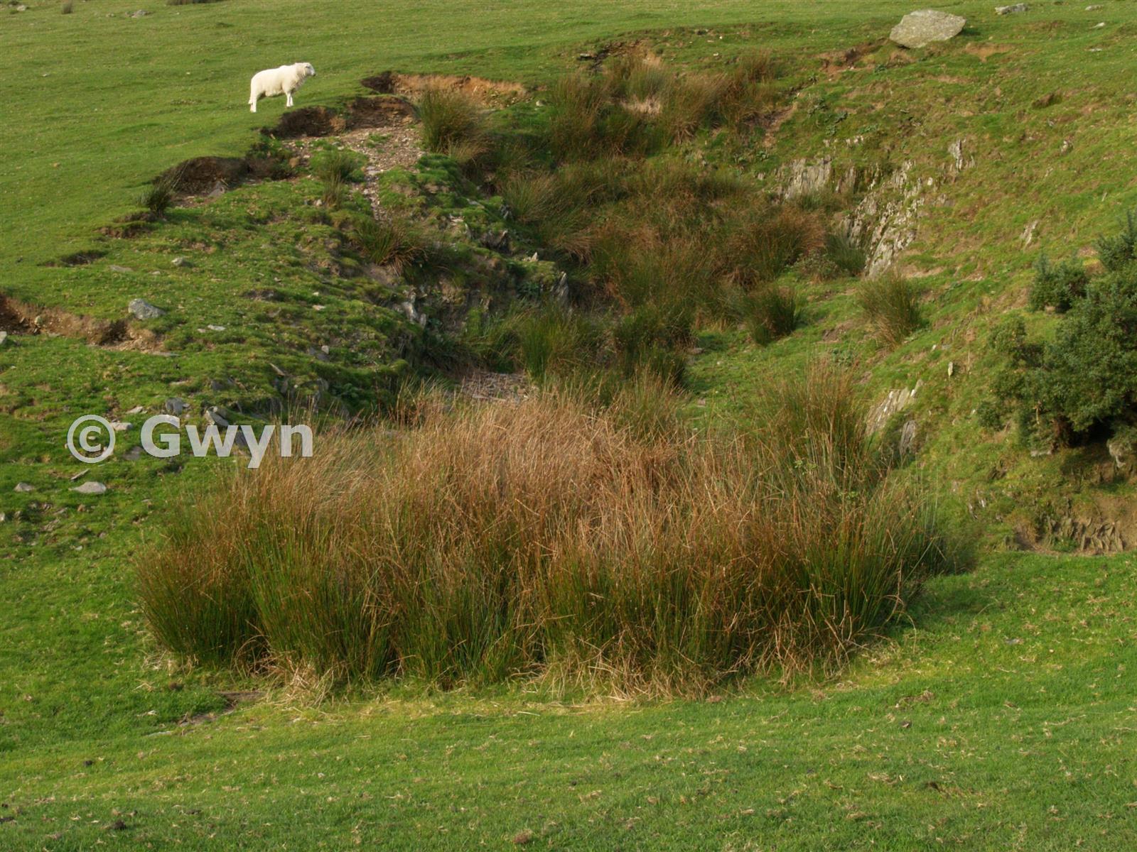 Just inside the mountain gate, the size of the spoil heap seems equal to the size of the twll. The spoil is well grassed over suggesting little waste rock, just overburden from a trial dig.No sign of two reputed adits. Landscape. Minor quarry. Minor mine. Attributed to Richards, 2007.