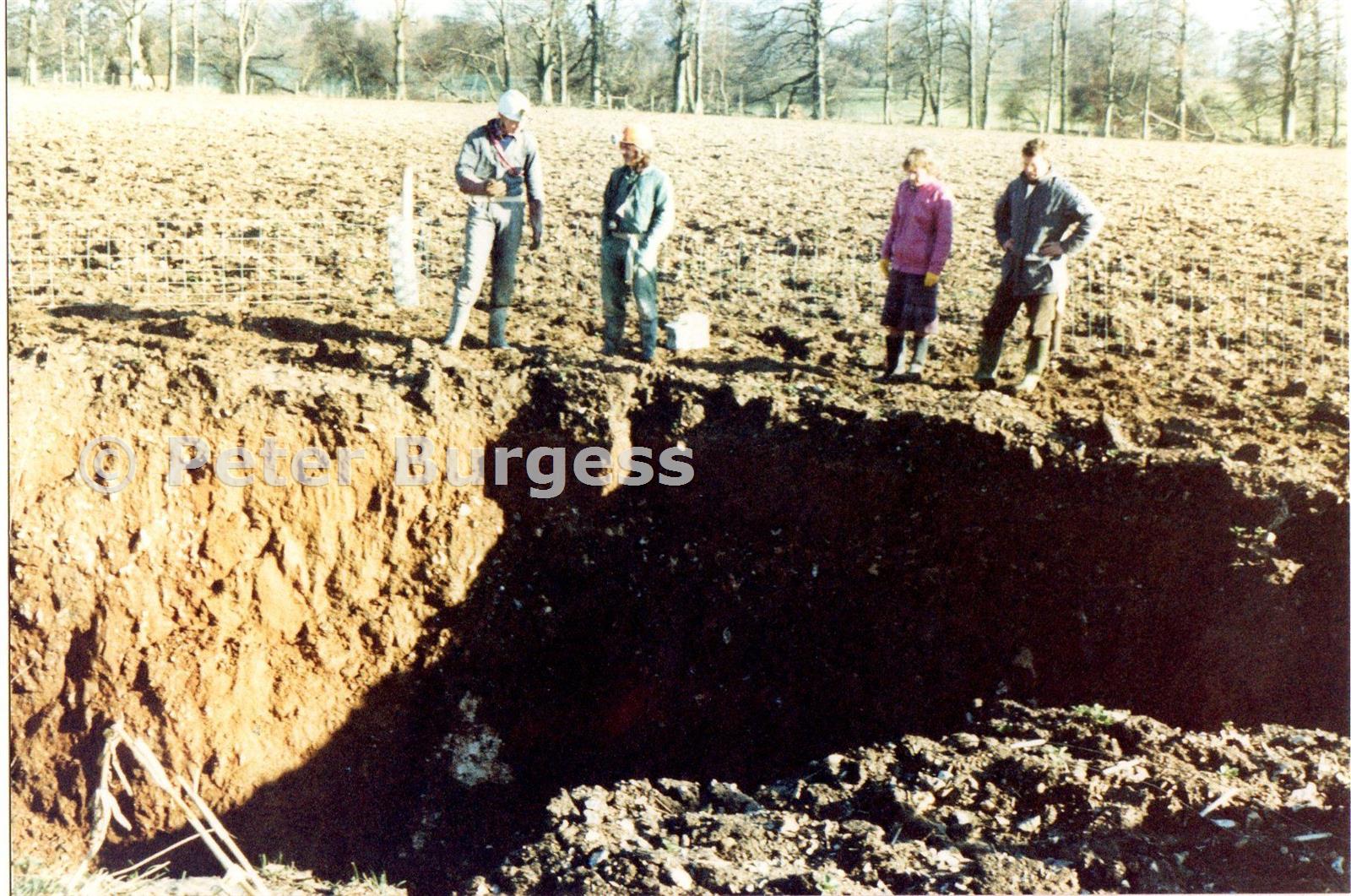A newly-opened up denehole in the middle of a field. When this happens in the middle of the living room, it is more serious. This happened in February 1988. It is probably a fourth denehole at Frinsted and not one of the three listed in the mine description.
