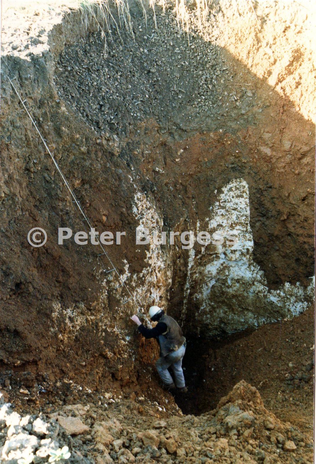 Descending the denehole (actually a chalk well). Note the big pile of discarded flints. February 1988.